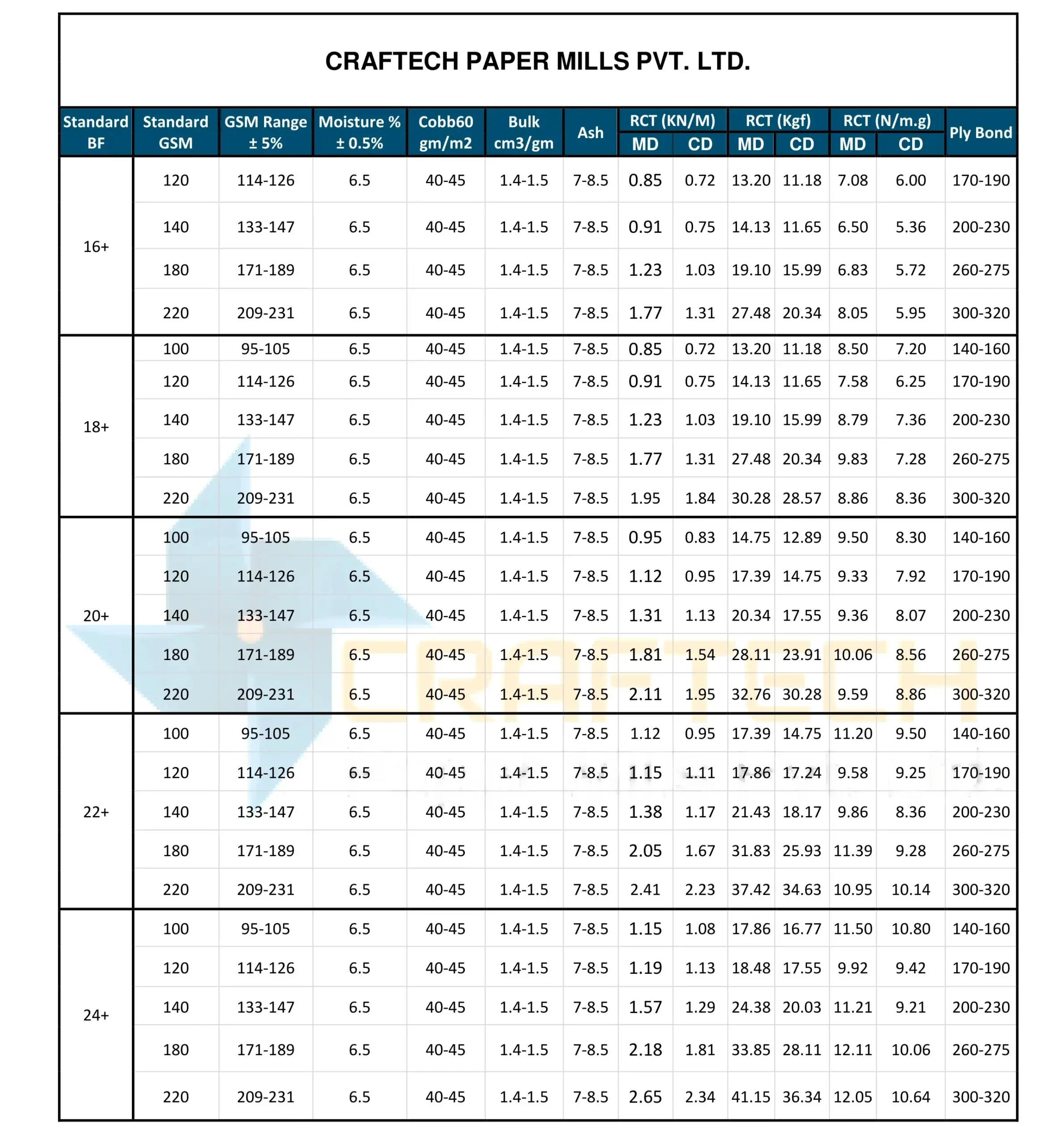 Our manufacturing excellence allows us to produce kraft paper with a basis weight (GSM) ranging from 100 to 300 and a burst factor (BF) spanning 18 to 28, specifically designed for a variety of applications.